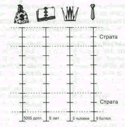 Неравенство расстояний между статусами — основное свойство стратификации. У нее четыре измерительных линейки, или оси координат. Все они расположены вертикально и рядом друг с другом: