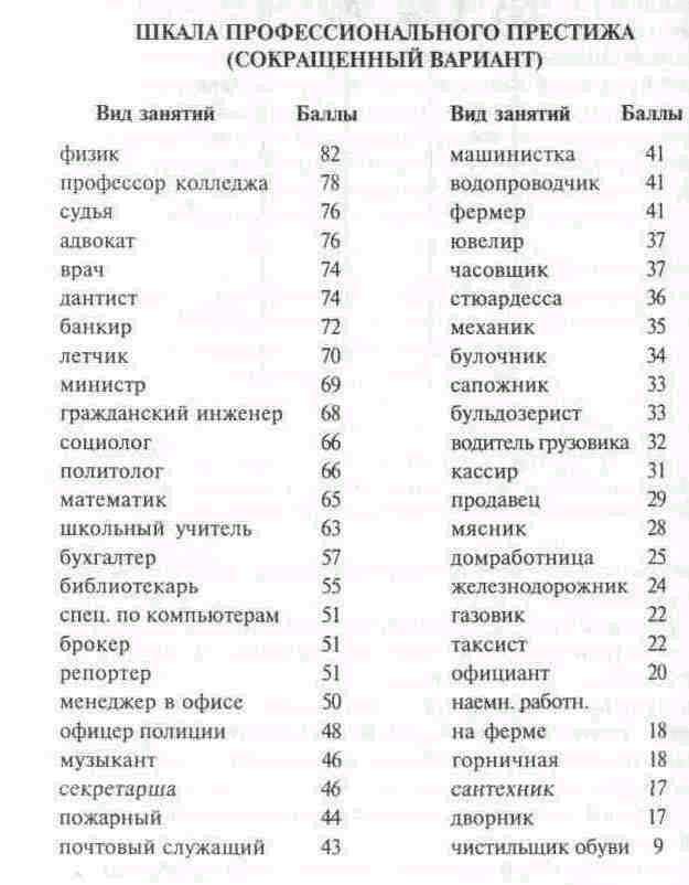хорошее, среднее, чуть хуже среднего, самое плохое занятие. II список попали практически все занятия от верховного судьи, министра и врача до сантехника и дворника. Рассчитав среднее по каждому занятию, социологи в баллах получили общественную оценку престижности каждого вида труда. Выстроив их в иерархическом порядке от самой уважаемой до самой непрестижной, они получили рейтинг, или шкалу профессионального престижа. К сожалению, в нашей стране периодических репрезентативных опросов населения о профессиональном престиже никогда не проводилось. Поэтому придется пользоваться американскими данными (см. табл.).