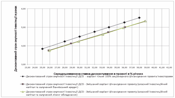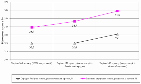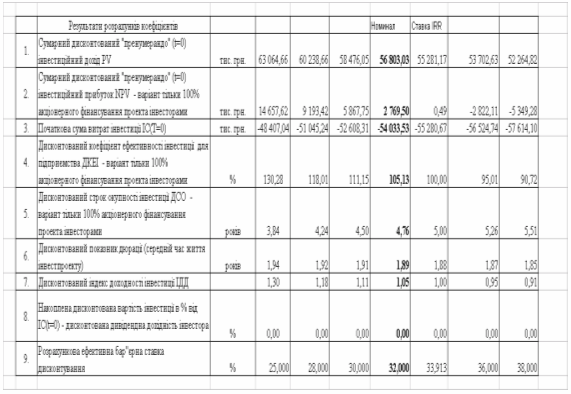 Показники дисконтованої ефективності в варіанті №3 інвестиційного проекту (акціонерний капітал+лізинг обладнання) - змінна ставка дисконтування WACC = 32-36%