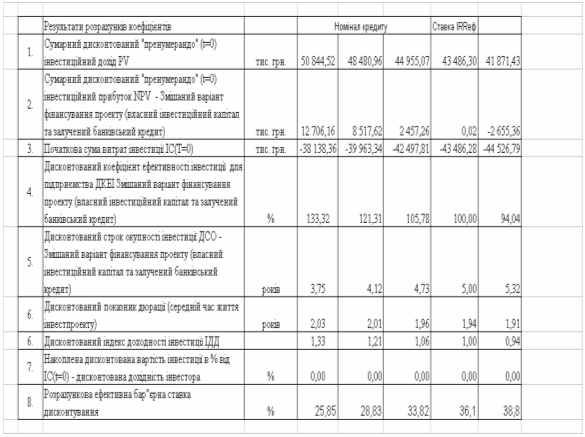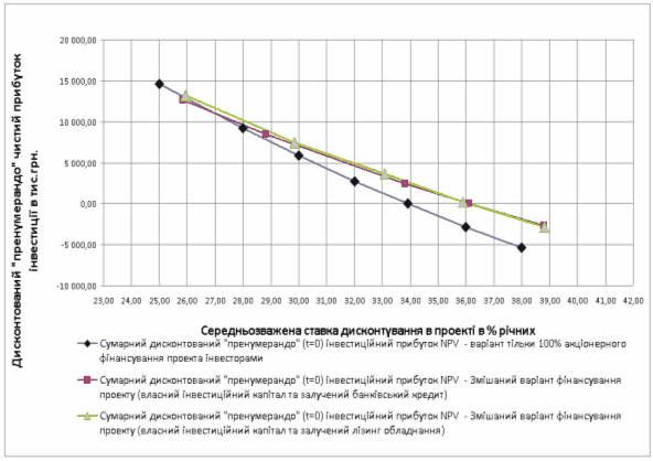Аналіз чутливості показників дисконтованої ефективності в варіанті №3 інвестиційного проекту (акціонерний капітал+лізинг) - від рівня ефективної змінної бар’єрної ставки дисконтування Rбар_еф