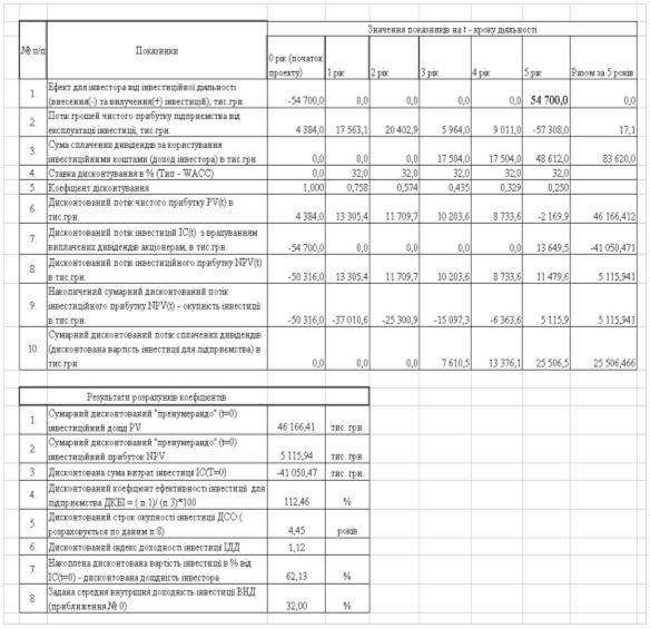 Показники дисконтованої ефективності в варіанті №2 інвестиційного проекту (акціонерний капітал+банківський кредит) - підваріант б) з поточною сплати дивідендів (32%) - постійна ставка дисконтування WACC = 32%