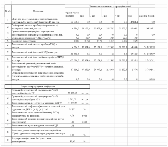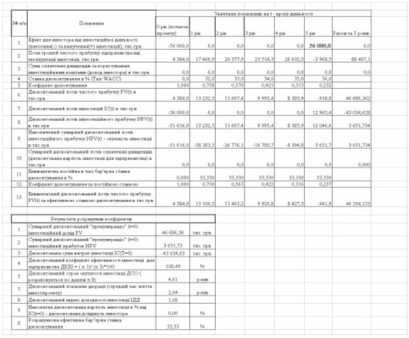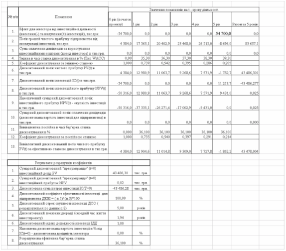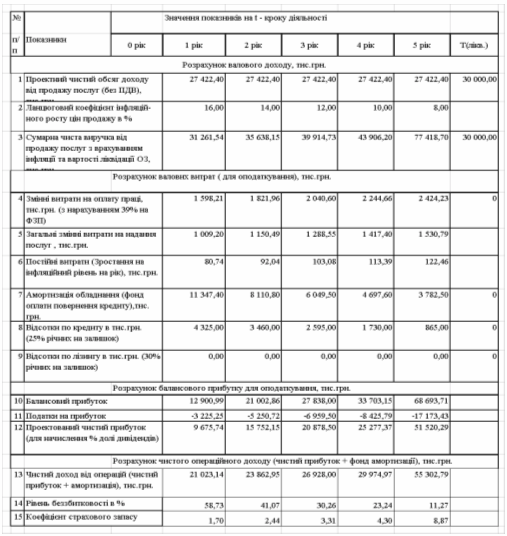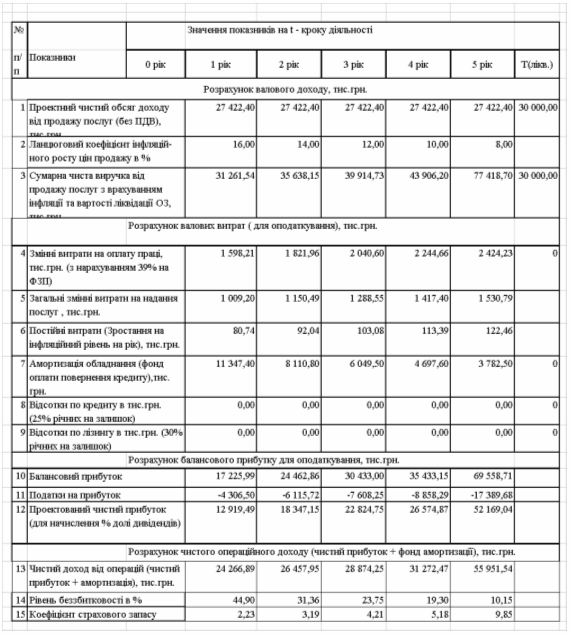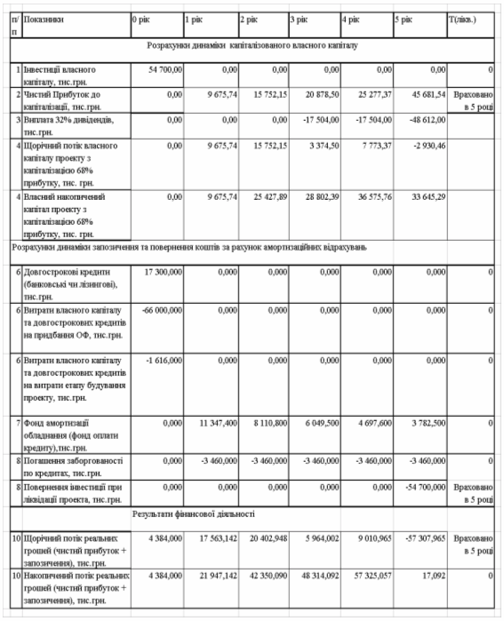 Розрахунки показників ефективності 5-ти річного етапа експлуатації (життєвого циклу) варіанта №1 інвестиційного проекта -