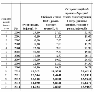 Статистика та прогноз рівня бар’єрних ставок в проекті (ставка дисконтування) для 1 моделі (рівень інфляції + мінімальний рівень вартості грошей) в Україні за даними Держкомстата [29] та Національного банку [30] у 2000 - 2009 роках