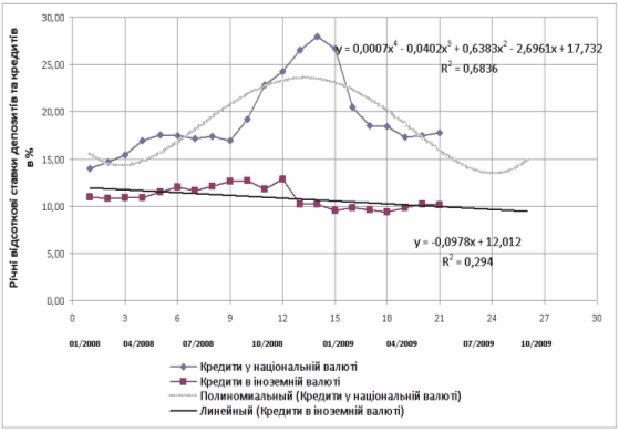Рис. Д.3. Річні ставки банківських кредитів в національній та іноземній валютах в 2008 - 2009 роках [30] та регресійні моделі динаміки їх трендів для прогнозу бар’єрних ставок в проекті