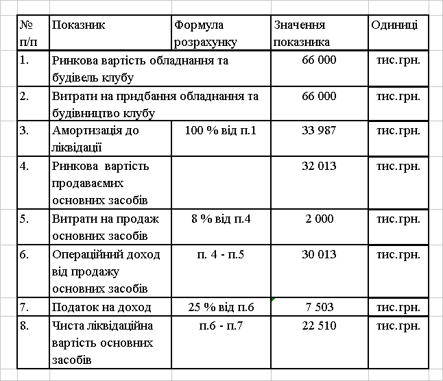 Розрахунковий рівень початової та ліквідаційної вартості основних засобів проекту міні-гольф клубу