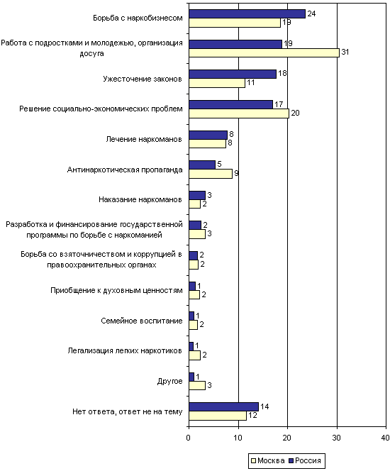 Крупнейшие федеральные программы, разработанными Госкомитетом по физической культуре и туризму, такие как "Дети России", "Молодежь России", "Патриотическое воспитание молодежи", уже вступили в силу. Основной целью программ является создание дееспособной, масштабной системы популяризации занятий физической культурой и спортом. По результатам разнообразных социологических опросов спорт не чужд большей половине населения нашей страны. Он выступает не только эффективным способом борьбы с наркоманией и юношеским алкоголизмом, что показывает Таблица 1 : опрос населения Москвы и России о способах снижения уровня наркомании среди молодежи, а также данные социологического опроса: "Что, по Вашему мнению, следует предпринимать, чтобы уберечь молодежь от употребления наркотиков?" Опрос проводился в школах, училищах и ВУЗах, и возрастная категория оценивалась от 15 до 24 лет.
