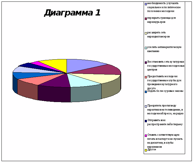 На первом месте среди предлагаемых мер - необходимость улучшить социальное и политическое положение молодежи (14%). На втором месте - требование перекрыть границы для наркокурьеров (13%). На третьем месте - рекомендации расширить сеть наркодиспансеров (12%). Далее следуют предложения усилить антинаркотическую кампанию (10%). Восстановить сеть культурных государственных молодежных центров (10%). Предоставить молодежи государственные клубы для проведения культурного досуга (9%). Издать более суровые законы (8%). Прекратить пропаганду наркотиков на телевидении, в молодежной прессе, на радио (7%). Отправить всех распространителей в тюрьму (5%). Ставить соответствующую печать в паспорт и не пускать на дискотеки, в клубы наркоманов (3%), Диаграмма 1.