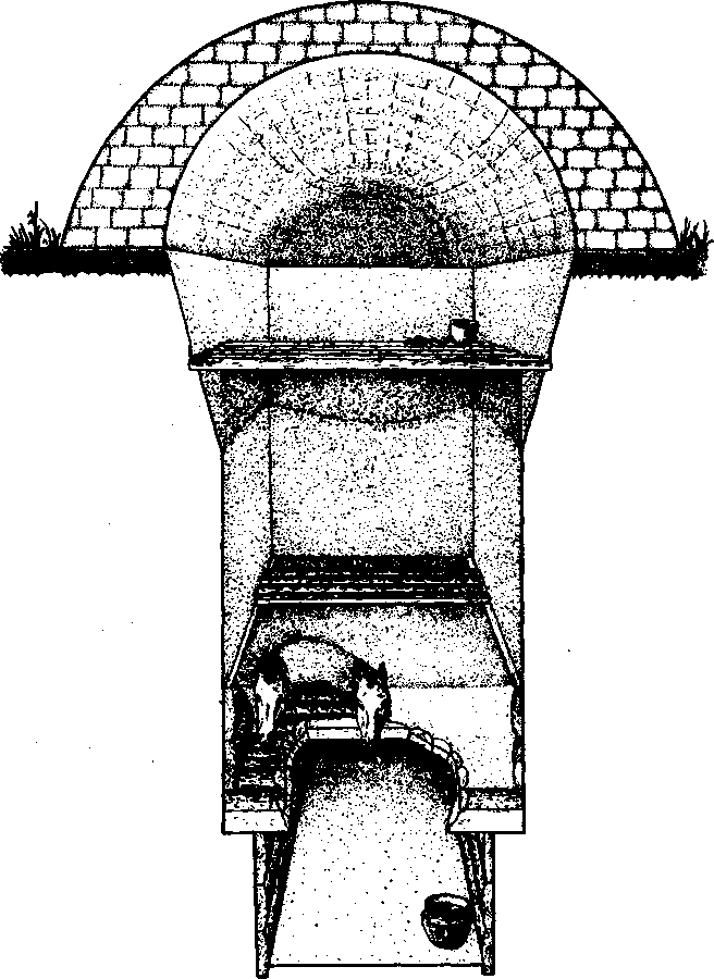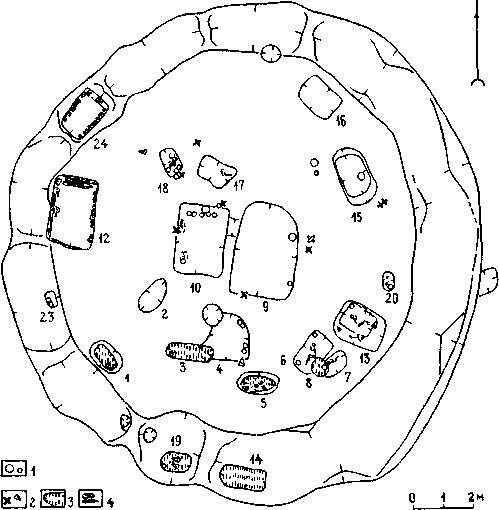 По материалам полевых исследований нами сделана реконструкция ямы 24. Яма была сооружена на последнем этапе функционирования комплекса в углублении кольцевого рва, который к тому времени уже примерно на одну треть глубины заполнился почвенными частицами. Глубина ямы превышает 3,5 м от уровня древней поверхности. На дне ямы помещается полая погребальная камера высотой 65-70 см, с размерами 2, 1 х 1, 2 м. Стенки камеры облицованы деревом. Камера имеет перекрытие из двух слоев деревянных плах, плахи из верхнего слоя обожжены в огне, причем еще до их использования в конструкции. На перекрытии лежат остатки жертвенных животных, пространство «жертвенной камеры» заполнено глиной. Выше располагается обширная, высотой около 1,5 м полая камера, перекрытая вверху еще одним слоем дерева. Сверху на перекрытие ямы насыпан слой грунта таким образом, что углубление рва в районе ямы сравнялось с окружающей поверхностью. На образовавшейся площадке возведено сооружение из глинобитных блоков в виде ложно-сводчатого купола.