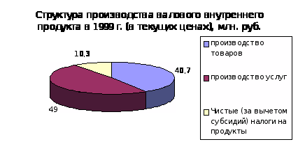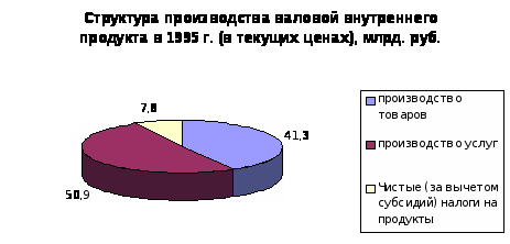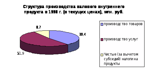 В структуре производства валового внутреннего продукта за период с 1992 по 2000 год наблюдается тенденция к уменьшению удельного веса производства услуг и товаров. Доля услуг в 1997 году составила 51,9 % против 50,7 % 1992 году, а доля производства товаров уменьшилась с 47,5 % в 1992 году до 39,4 % в 1997 году. В 1998 году значительных изменений в структуре производства валового внутреннего продукта. Также в структуре произведенного валового внутреннего продукта в 1997 году значительно сократился удельный вес практически всех отраслей экономики, производящих товары (на 2,2%). Это связано с повышение доли производства услуг при сокращении спроса на продукцию этой сферы деятельности явилось, прежде всего, отражением спада деловой активности в остальных отраслях. С другой стороны, рост доли услуг обусловлен также позитивными структурными изменениями в этом секторе экономики. Растет, в частности, доля связи, торговли, операций с недвижимостью, финансово-кредитных и страховых услуг и других их видов, имеющих прежде всего рыночный характер. В 1999 и 2000 годах наблюдается рост объема производства товаров и снижение роста производимых услуг. А что касается соотношения доли товаров и услуг в структуре производства валового внутреннего продукта, то оно не претерпело значительных изменений. В 1999 году производство товаров составило 40,7 %, а услуг 49 %. В 2000 году доля производимых товаров в структуре производства валового внутреннего продукта равна 41,3 %, а доля услуг 47,2.