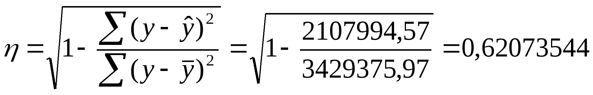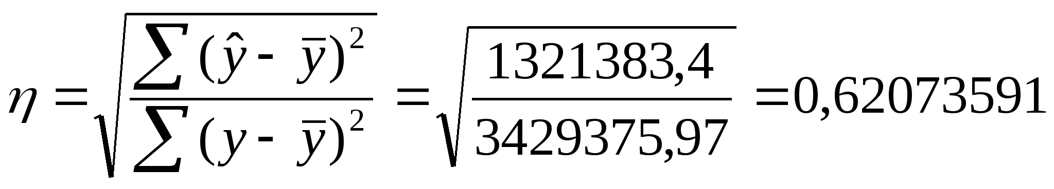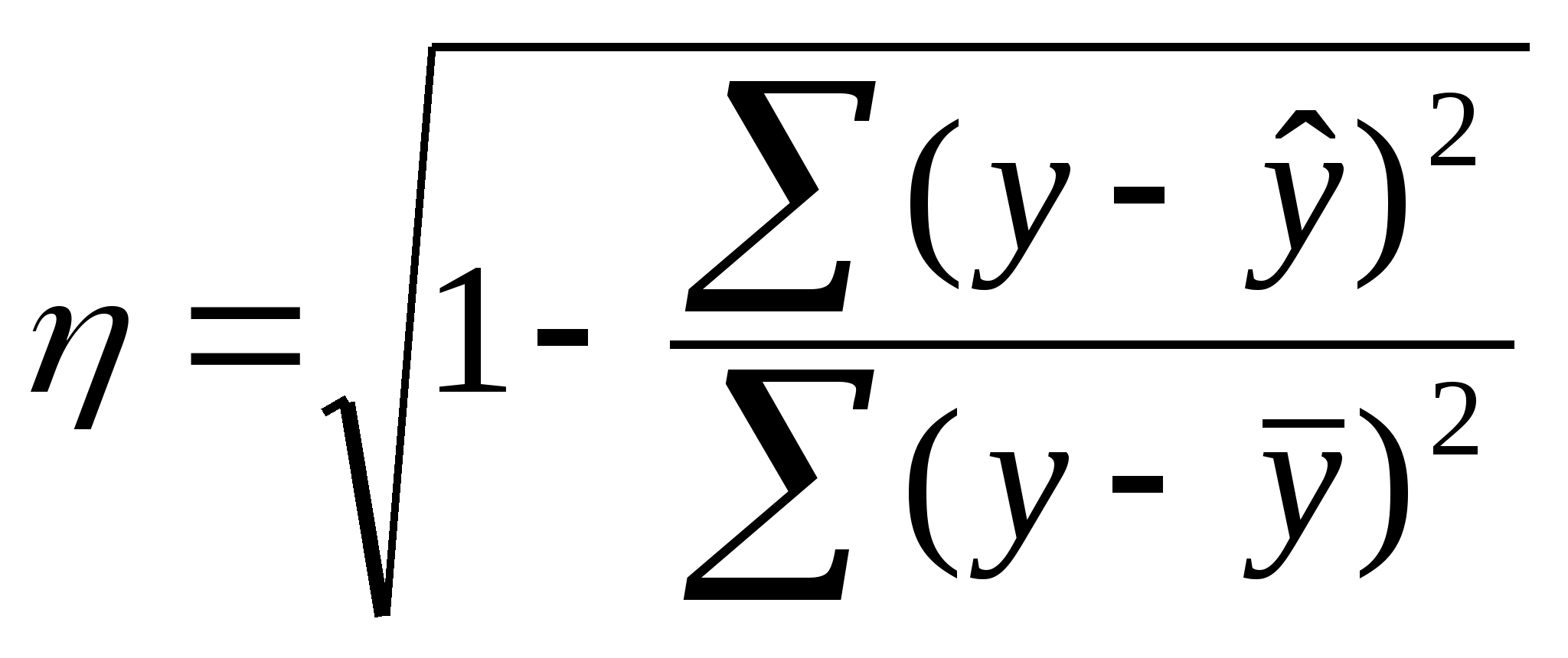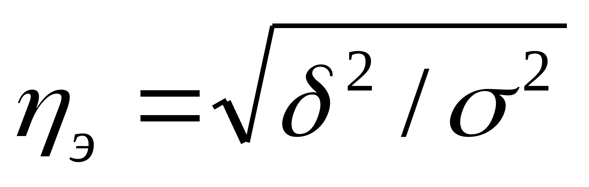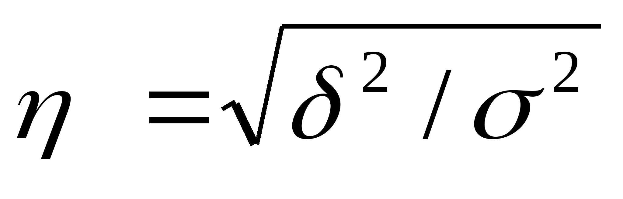 Теоретическое корреляционное отношение η представляет собой относительную величину, получающуюся в результате сравнения среднего квадратического отклонения выравненных значений результативного признака δ, то есть рассчитанных по уравнению регрессии, со средним квадратическим отношением эмпирических (фактических) значений результативности признака σ: