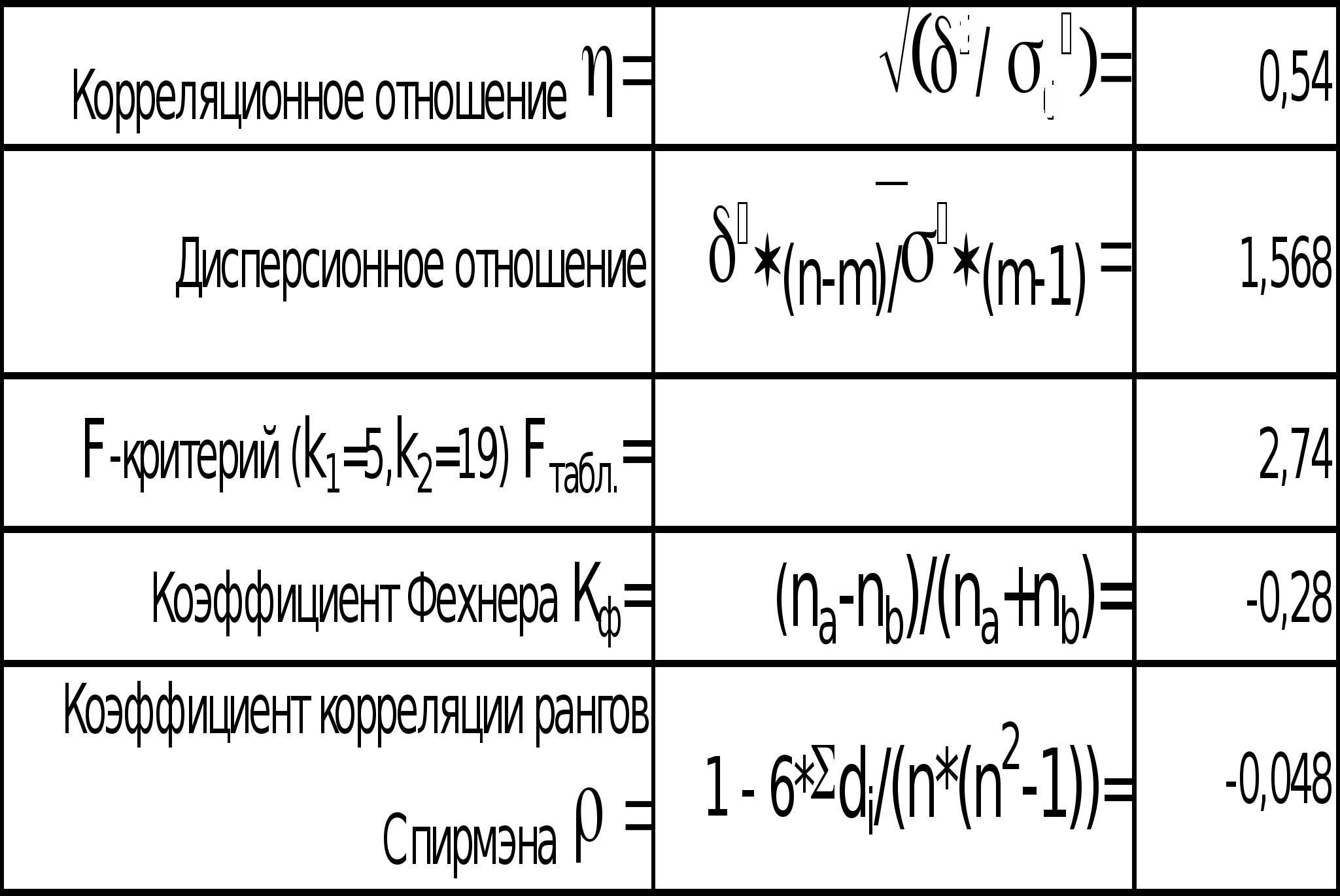 Корреляционное отношение (=0,54) показывает незначительную тесноту связи. Значимость рассчитанного корреляционного отношения оценивается с помощью дисперсионного отношения, равного 1,568. Так как 1,568<2,74 (F-критерий = 2,74), то оценивать тесноту связи с помощью корреляционного отношения нельзя из-за его несущественности.