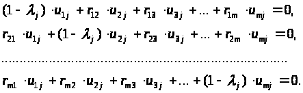 Решив характеристическое уравнение, находят его корни λ>j>. После этого вычисляют собственные векторы матрицы R. Реально это означает решение m систем линейных уравнений для каждого λ>j> при j = 1..m. В общем виде система имеет вид: