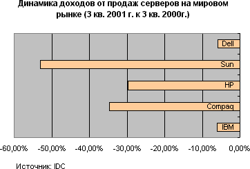 По исследованиям IDC, с третьего квартала 2000 года по третий квартал 2001 года объем рынка серверов сократился на 30% - с $15,2 млрд. до $10,7 млрд.