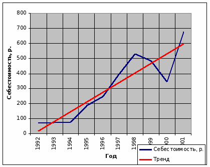 При изучении динамики себестоимости яиц в СХОАО «Белореченское» 1992-2001гг было выявлено то, что себестоимость яиц (в среднем) имеет тенденцию к повышению (ежегодно на 65,38р). В среднем колебания себестоимости по годам от среднего уровня составляет ±84,14р. или 27,39%.