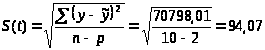 При выравнивании объединяются эти две формулы и формула средней ошибки прогноза для линии тренда на 2003г от середины базы прогноза выглядит так: