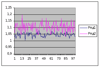 Рис. 1. Данные имитационного моделирования необходимого коэффициента покрытия пенсионных обязательств. Метод «закрытого фонда». Условные когорты численностью 5000 (ряд 1) и 1000 (ряд 2).