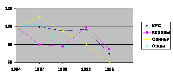 В 1996 году в личных подсобных хозяйствах населения поголовье возросло на 18,5%, в том числе коров - на 58,7%, поголовье овец и коз здесь увеличилось в 2,3 раза [9, с.67]