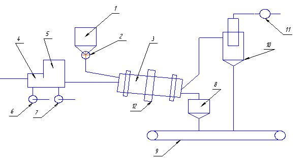 1 – барабан; 2 – питатель; 3 – сушильный барабан; 4 – топка; 5 – смесительная камера; 6, 7, 11. – вентиляторы; 8 – промежуточный бункер; 9 – транспортёр; 10– циклон; 12 – зубчатая передача.