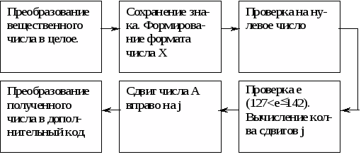 Поскольку мантисса результата формируется путем сдвига исходного числа влево, то регистры R2, R3 используем для размещения мантиссы результатов.