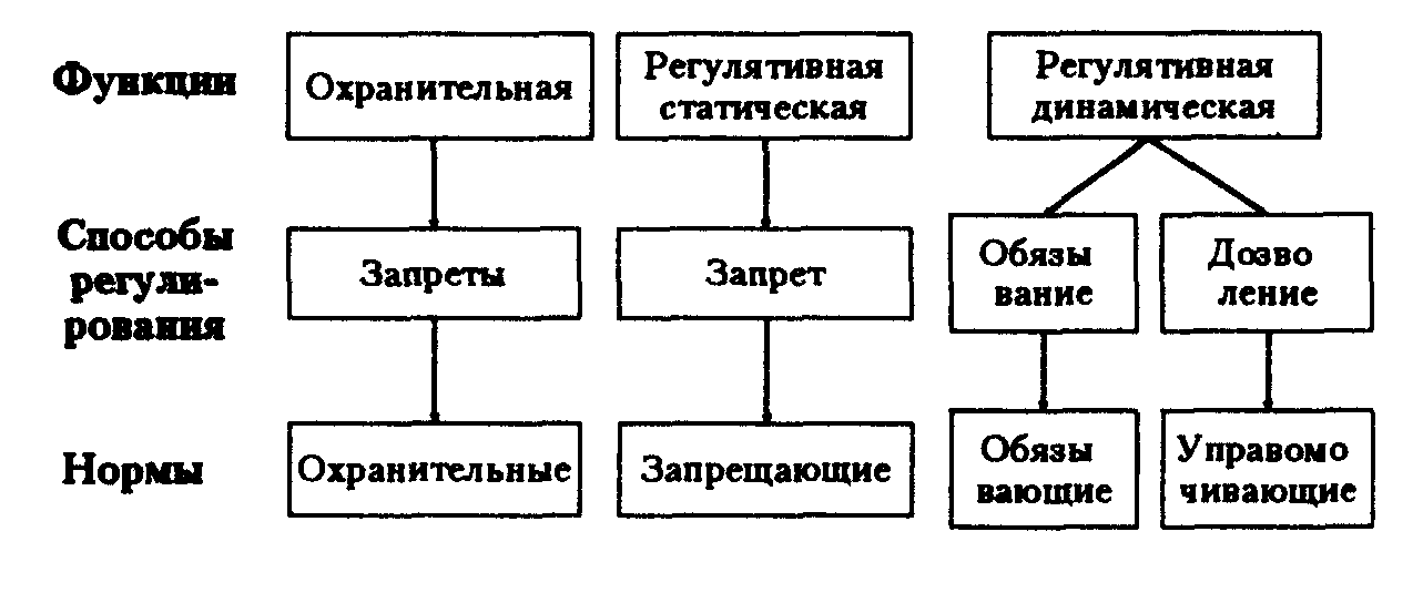 Как регулятивные, так и охранительные нормы направлены на осуществление функций права: регулятивной (статической и динамической) и охранительной. В них находят выражение способы регулирования.