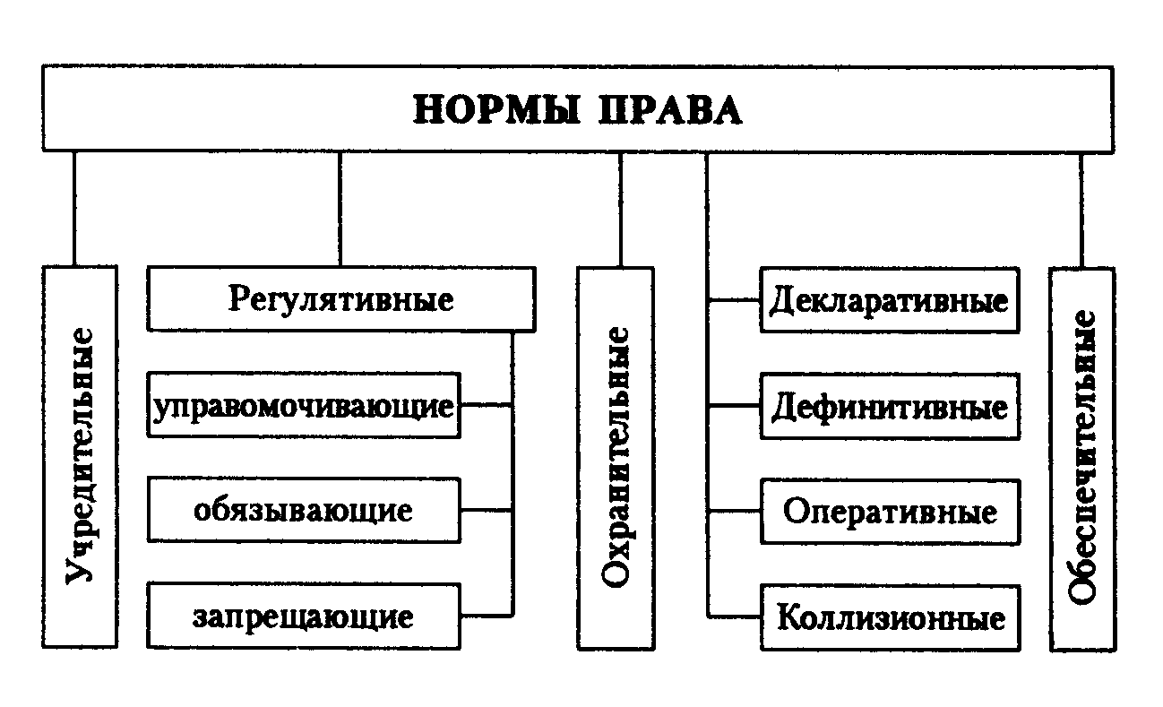 2. По социальному назначению и роли в правовой системе нормы можно подразделить: на учредительные (нормы-принципы), регулятивные (нормы — правила поведения), охранительные (нормы — стражи порядка), обеспечительные (нормы-гарантии), декларативные (нормы-объявления), дефинитивные (нормы-определения), коллизионные (нормы-арбитры), оперативные (нормы-инструменты).