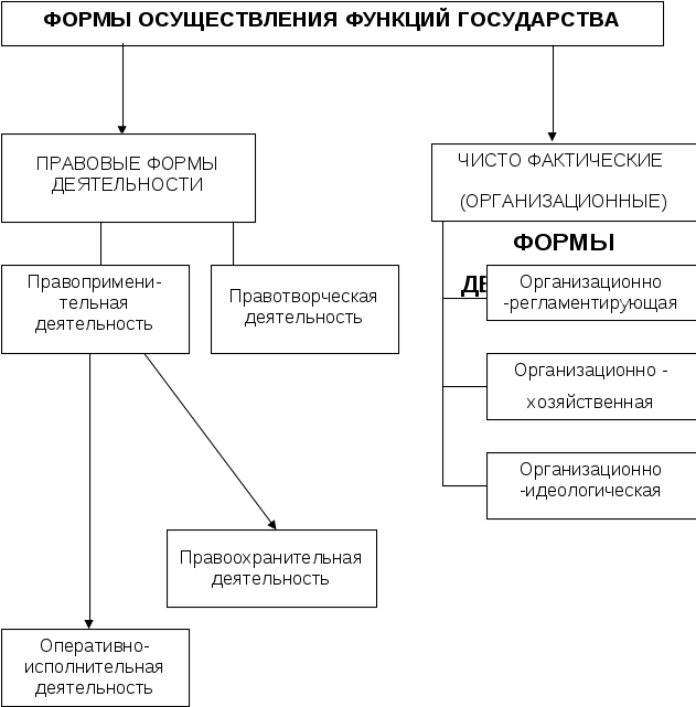 Под правовыми формами осуществления функций государства понимается однородная по своим внешним признакам (характеру и юридическим последствиям) деятельность государственных органов, связанная с изданием юридических актов. Соответственно этому к правовым формам реализации функций государства относятся правотворческая деятельность и правоприменительная деятельность, которая, в свою очередь, подразделяется на:
