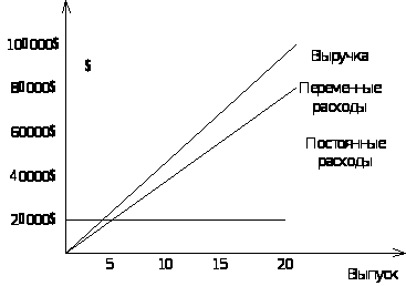 Заметим, что на этом графике линия выручки и линия переменных расходов исходят из одной точки и разница между ними и есть не что иное, как маржинальный доход. Используя данный график мы можем легко определить величину прибыли или убытка для того или иного объема выпуска.