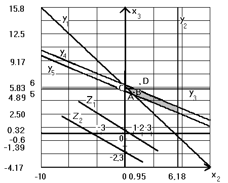 Мы получили, что график функции Z>2> расположен ниже чем график функции Z>1>. Однако Z>2> > Z>1> (9000 > 8000). Следовательно своего максимального значения целевая функция достигает в самой нижней точке области относительно целевой функции (в той точке, через которую график целевой функции будет проходить первым при уменьшении целевой функции). Обозначим эту точку на графике A. Координаты точки A (0,95;4,89). x>2> = 0,95; x>3> = 4,89, что соответствует решению с помощью симплекс – метода.