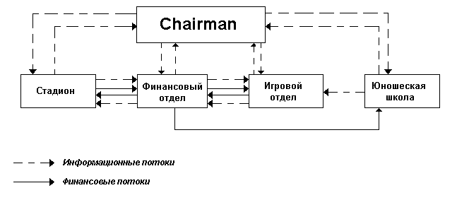Горизонтальные связи - это связи между двумя и более равными по положению в иерархии или статусу частями организации. Их главное предназначение - способствовать наиболее эффективному взаимодействию частей организации. На самом деле, в отличие от вертикальных, горизонтальные связи, кроме случая матричной департаментизации, обычно не формируются в ходе проектирования организации. Поэтому изучение таких связей в уже существующей организации представляет особый интерес. Ниже, на рис.2, приведена схема связей между частями "Челси" в виде информационных (пунктирные стрелки) и финансовых (сплошные стрелки) потоков.