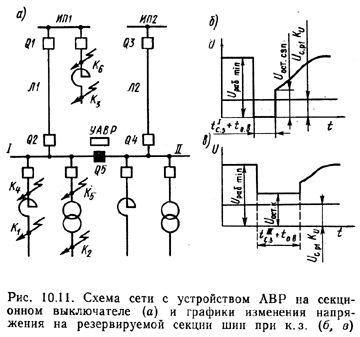 (рис.10.11,а). В этой схеме шины секционированы; секционный выключатель Q5 отключен. Каждая секция питается от отдельного источника. Схему УАВР можно выполнить так, что устройство будет действовать на включение секционного выключателя Q5 при отключении любого из источников питания и исчезновения напряжения на любой секции шин. В том случае осуществляется взаимное резервирование с помощью УАВР двухстороннего действия.