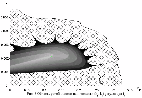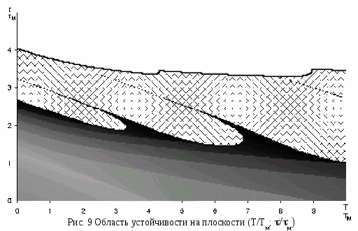 По рис. 8 можно определить направление расширения области (в сторону "гребней"), в которой, при увеличении интервала моделирования, переходный процесс успеет завершится. Во всех остальных областях устойчивости наблюдается аналогичная картина – лучеобразное расширение области при увеличении интервала моделирования (например, рис. 9 – область устойчивости (T/T>м>; />м>)).