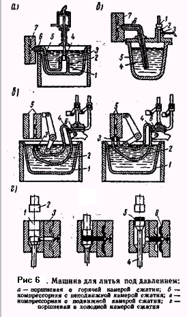 Для литья под давлением применяют машины поршневого действия с горячей и холодной замерами, машины компрессорного действия с неподвижной и подвижной камерами сжатия (рис. 6). Машины поршневого действия с горячей камерой сжатия (рис. 6, а) применяют) для отливки деталей из сплавов, имеющих температуру плавлением до 450° конструкции эти машины разделяют на ручные, полуавтоматы и автоматы, все они работают по одному принципу. В чугунную ванну 3 заливают жидкий металл. Для поддержания постоянной температуры металла ванну подогревают. Жидкий металл из ванны через отверстия 2 заполняет полость цилиндра и подводящий канал Ь. При повороте пусковой рукоятки обе половины формы закрываются. Одновременно с закрытием формы штуцер 6 прижимается к устью ходового канала формы 7. Затем автоматически выключается пневматический цилиндр, под действием которого поршень поднимается и форма закрывается, освобождая отливку. После этого форму обдувают и операцию заливки повторяют. Производительность полуавтоматических машин до 250 и автоматических до 1000 заливок в час. Давление достигает от 6 до 25 от (6-105^25-105 м/и*2).