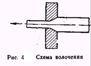 Процесс волочения — это протягивание прокатной или прессованной заготовки через отверстия, размеры которых меньше сечения заготовки (рис. 4).