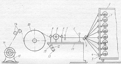 Исследования и опыт работы предприятий показали, что более распространенным является прерывный вид снования. Изучение начинают с ознакомления со схемой процесса снования.