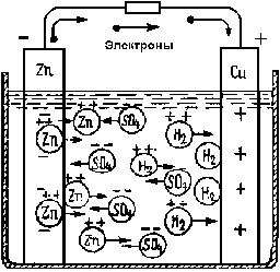 Если соединить электроды элемента проводником, т. е. создать замкнутую цепь, то под действием разности потенциалов по внешней цепи от цинка будут двигаться электроны. Так как они уходят с цинкового электрода, то его отрицательный потенциал начинает уменьшаться и электрическое поле между ним и раствором ослабевает. Но тогда новые положительные ионы цинка переходят в раствор. Тем самым поддерживается определенный отрицательный потенциал цинкового электрода.
