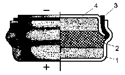 1 – стальной корпус с положительным электродом; 2 – пористая прокладка; 3 – резиновая уплотняющая прокладка; 4 – крышка корпуса с отрицательным электродом.
