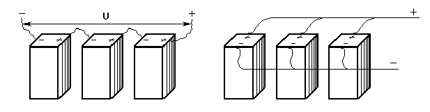 Рис.6. Последовательное и параллельное соединение элементов в батарею.
