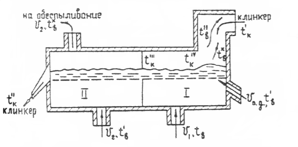 Расход тепла: 1. Вторичный воздух L>вт> * б * i>в>вт 2. Выбрасываемый воздух V>2>уд * i>в>х 3. Выходящий клинкер i>k>‘‘ 4. Потери в окружающую среду q>п>’ + q>п>’’ |