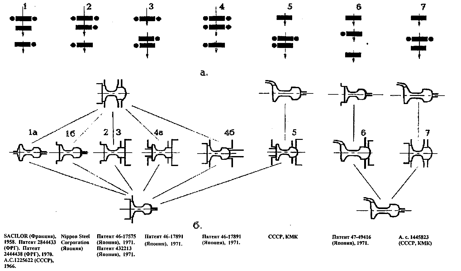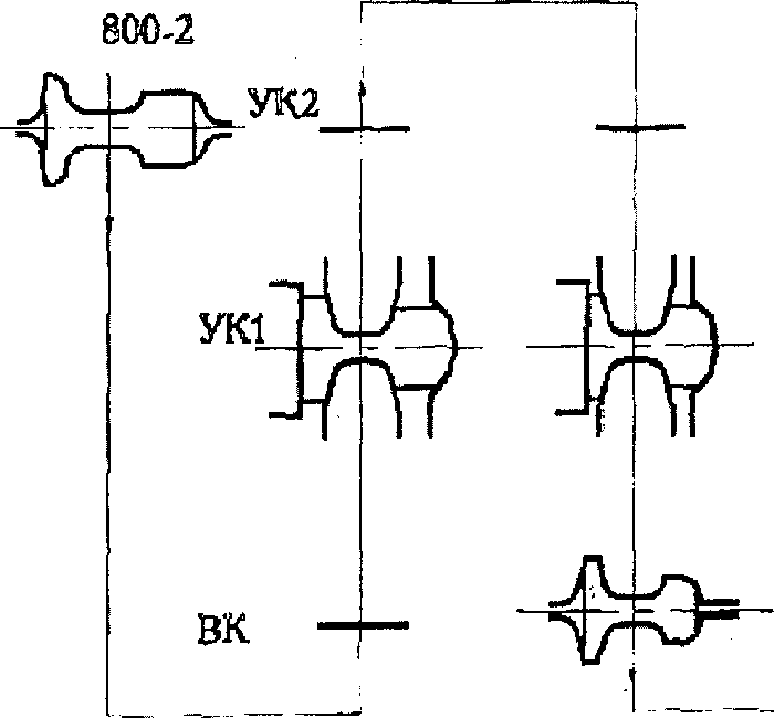 По существу известные способы прокатки рельсов с применением универсальных клетей отличаются типом клетей и калибров, а также порядком прокатки в трех последних проходах (рис. 13.2).