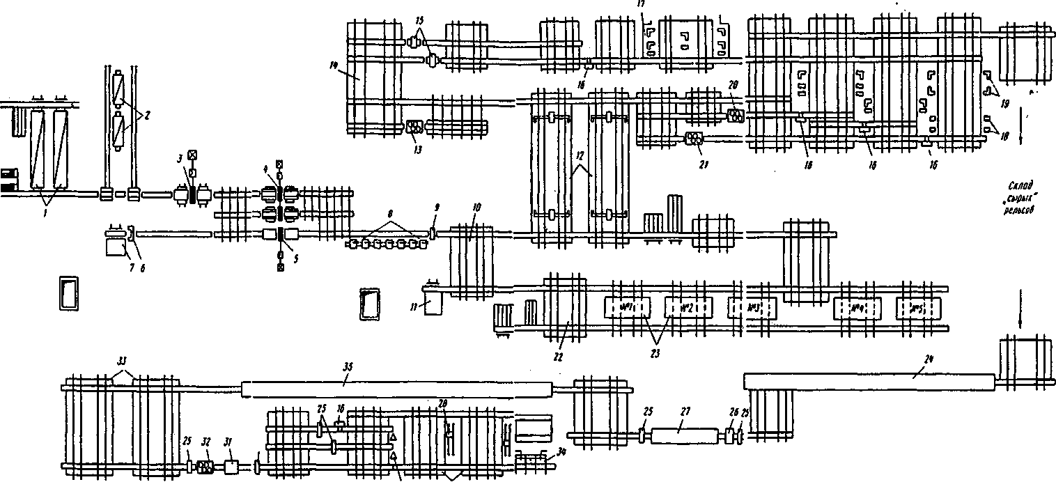1 - методические нагревательные печи; 2 - камерные нагревательные печи; 3 - обжимная двухвалковая клеть 950; 4 - черновая и предчистовая трехвалковые клети 800; 5 - чистовая двухвалковая клеть 850; 6 - ножницы горячей резки; 7 - стеллаж возвратного потока; 8 - маятниковые пилы горячей резки; 9 - клеймовочная машина; 10, 22 - передаточный швеллер для проката из качественной стали и рельсов; 11 - стеллаж для проката из качественной стали; 12 - центральные холодильники; 13, 20, 21, 32- горизонтальные роликоправильные машины; 14 - распределительный стеллаж; 15 - горизонтально-правильные прессы; 16 - вертикально-правильные (штемпельные) прессы; 17 - установки для закалки концов рельсов; 18 - установки по центровке рельсов; 19 - станки сверлильно-фрезерные; 23 - печи изотермической выдержки рельсов; 24 - печь для нагрева рельсов под закалку; 25, 28 - кантователи рельсов; 26 - установка термоправки рельсов; 27 - закалочная машина; 29 - инспекторские стеллажи; 30 - установка замера твердости головки рельса; 31 - вертикальная роликоправильная машина; 33 -холодильники за отпускной печью; 34 - пакетирующее устройство; 35- печь для отпуска закаленных рельсов