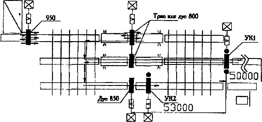 Заканчивается прокатка в клети УК2, которая может быть установлена или на место существующей клети дуо 850 (с использованием существующего привода) или рядом. За клетью УК1 необходимо установить рольганг длиной ~ 50 м. Привод клети УК1 осуществляется от электродвигателя, установленного в становом пролете на месте существующего стенда для перевалки валков.