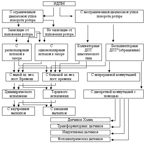 МД могут классифицироваться по их назначению, принципу действия, роду тока, а также по конструктивному выполнению: одноименнополюсные или разноименнополюсные, с радиальным воздушным зазором или торцевые, с неподвижной (барабанной, кольцевой) или подвижной обмоткой, с зубцовопазовой зоной или беспазовые (с гладким якорем), коллекторные или вентильные, с ограниченным или неограниченным углом поворота и т. д. .