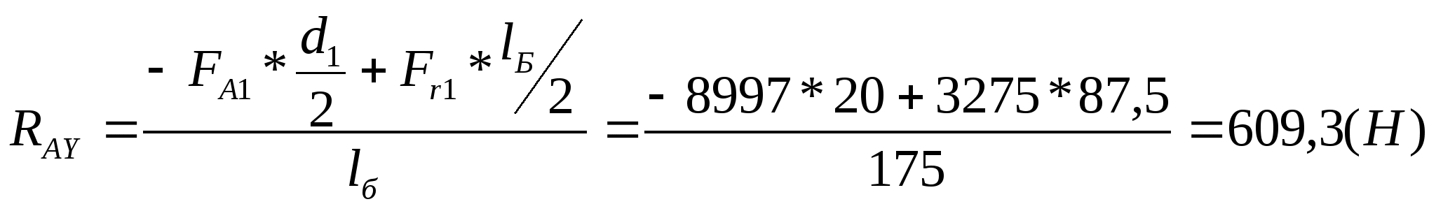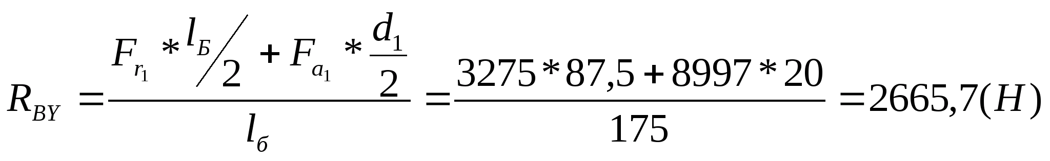 7.5. Эскизная компановка редуктора: 8. Расчетная схема валов редуктора. 8.1. I вал – определение реакций в подшипниках. 9. Проверочный расчет подшипников. 9.1. Быстроходный вал. Подшипники установлены враспор. (см. рис. 9.1.б) А) Определим осевые составляющие радиальных реакций: Б) Определим осевые нагрузки подшипников: В) Определим отношения: Г) По отношениям выбираем формулы для определения R>Е>: Д) Определим динамическую грузоподъемность по большему значению эквивалентной нагрузки: 9.2. Тихоходный вал. Подшипники установлены враспор. А) Определим осевые составляющие радиальных реакций: