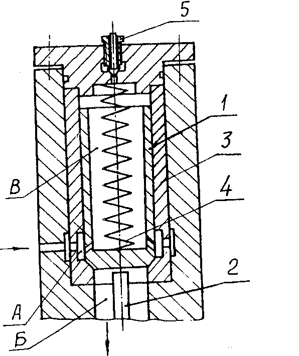 Таким образом обеспечивается, например, переключение с рабочего хода на обратный ход, или с холостого хода на рабочий и т.п. Давление срабатывания регулируется путем изменения затяжки пружины / с помощью регулировочного винта 4. Каналы Б и В предназначены для дренажа утечек и соединяются с линией слива. Серийно выпускаются реле давления, рассчитанные на 50 МПа, время срабатывания составляет 0,05 ... 0,10 с.