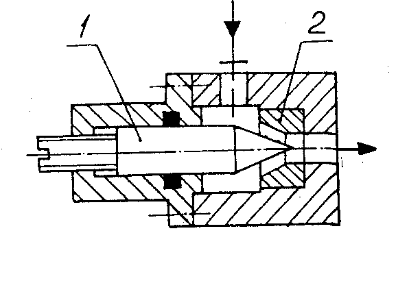 Сущность пневматического распыления состоит в том, что в результате дробления жидкости струей сжатого воздуха ЛКМ переходит в состояние аэрозоля, аэрозольные частицы движутся в направлении воздушной среды и на отделываемой поверхности сливаются в сплошной слой. Распыление материала происходит в форсунке, которая является основной частью распылителей (рис.1). Скорость воздушной струи на выходе из форсунки должна составлять 300 - 450 м/с, давление воздуха в зависимости от конструкции лакораспылителя 0,25 - 0,55 МПа. Оптимальное значение вязкости ЛКМ - 25 - 35 с по ВЗ-4, размер аэрозольных частиц при этом составляет 6 - 80 мкм. Различают форсунки с воздушным и материальным соплом.