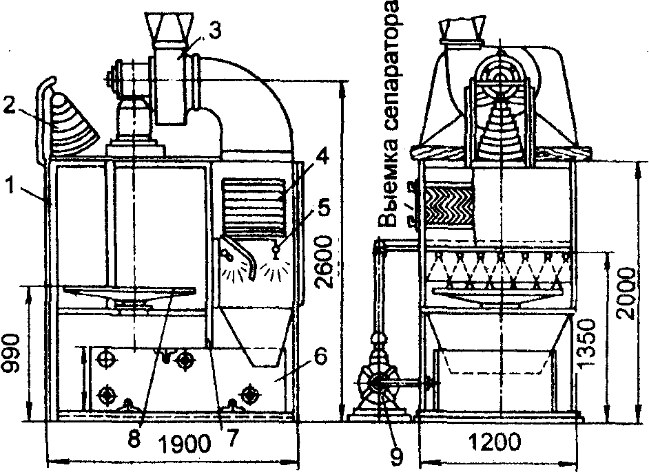 4 - сепаратор; 5 - гидрофильтр 6 - ванна;7 -решетка; 8 - поворотный стоя; 9 - насос