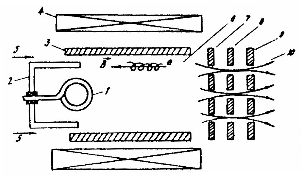 1 - термокатод, 2 - экран катода,3 - цилиндрический анод, 4 - соленоид, 5 - ввод рабочего газа,6 - плазма,7 - эмиссионный электрод, 8 - ускоряющий электрод, 9 - замедляющий электрод, 10 - ионный пучен