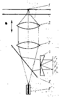 1 - считывающее пятно; 2 - считывающий объектив; 3 - оптическая система для преобразования излучаемого полупроводниковым лазером волнового поля в плоское волновое поле; 4 - призма; 5 - полупрозрачное зеркало; 6 - полупроводниковый лазер; F>1> - F>4> - фотоприемники.