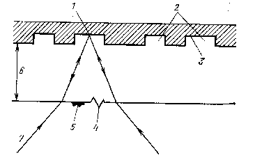 1 - фокальное пятно (Æ » 1 мкм); 2 - структура микроуглублений; 3 - зеркальное покрытие; 4 - царапина; 5 - частица пыли; 6 - прозрачный защитный слой; 7 - луч от лазера