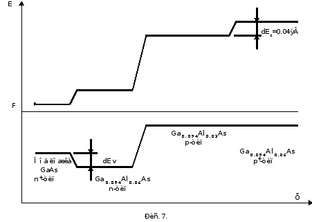 Для улучшения выходных характеристик гетероструктурного лазера в процессе получения гетероструктуры создают условия, обеспечивающие ограничение носителей заряда в активной области. Для структуры, изображенной на рис. 6, б, диаграмма энергитических зон приведена на рис. 7. Из-за того, что ширина запрещенной зоны у полупроводника больше в области с увеличением концентрацией атомов Al, возникают смешения в зоне проводимости на p—p+-переходе (dE>c>) и в валентной зоне на n—p- и